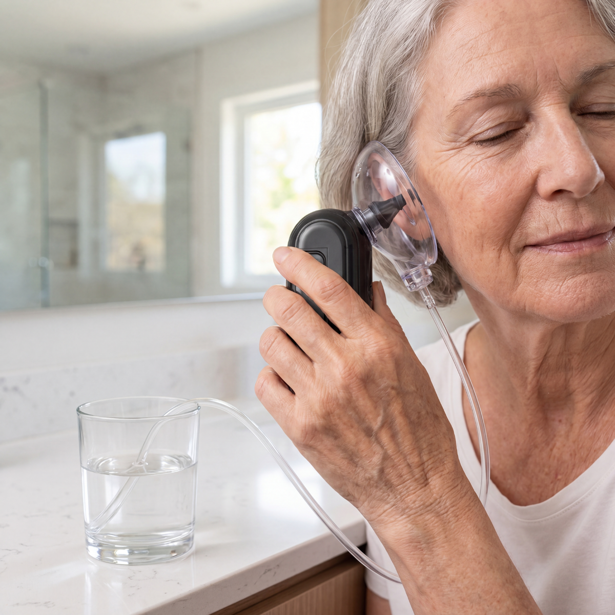 Elektryczny czyścik do uszu wykorzystuje delikatny strumień wody, który pomaga oczyścić kanał słuchowy bez nacisku i bez ryzyka podrażnień.